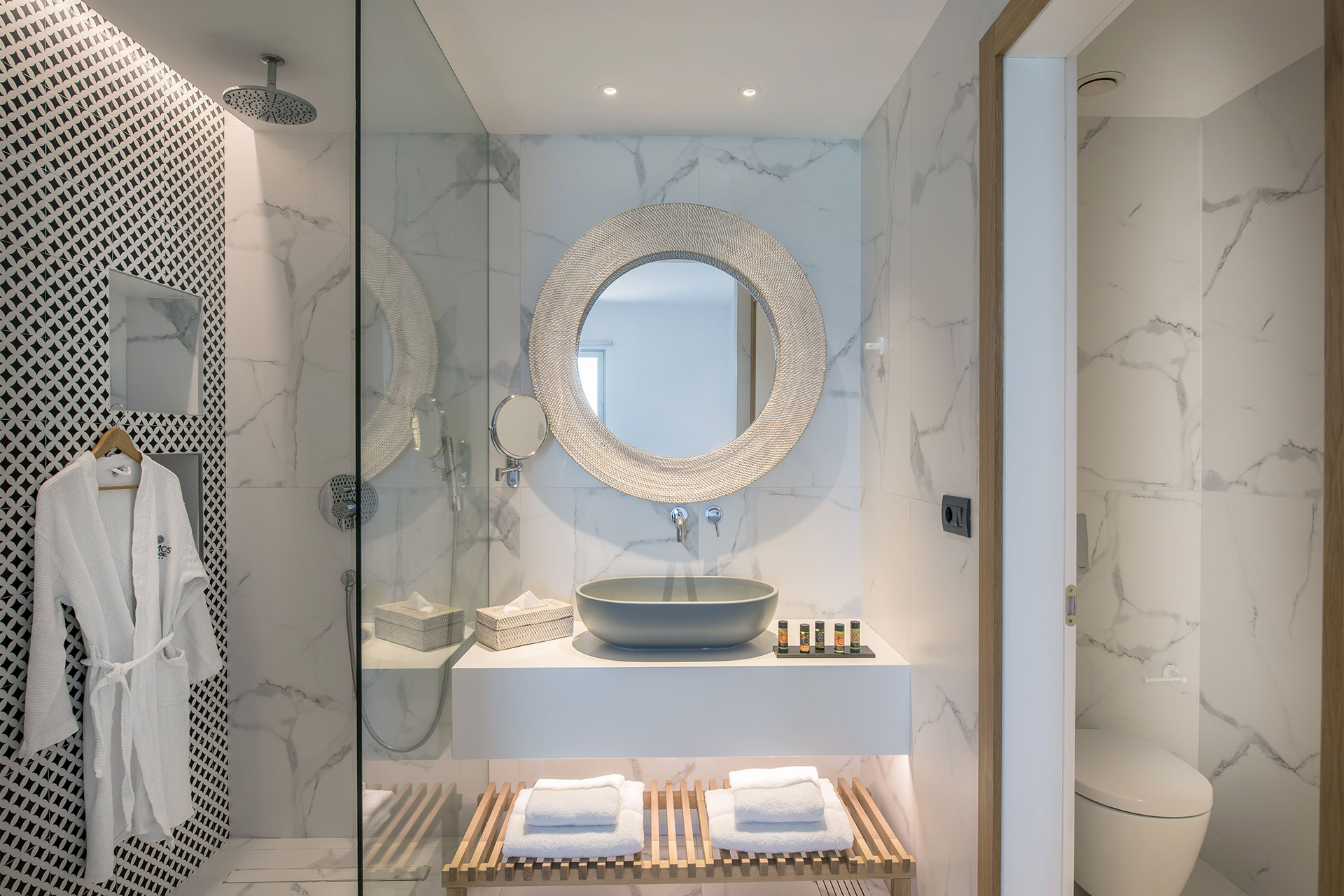 It consists of a double bed (or two twin beds) and can accommodate up to two persons. It features en-suite bathroom with a walk-in shower and a toilet. A furnished balcony or terrace without view is also available.