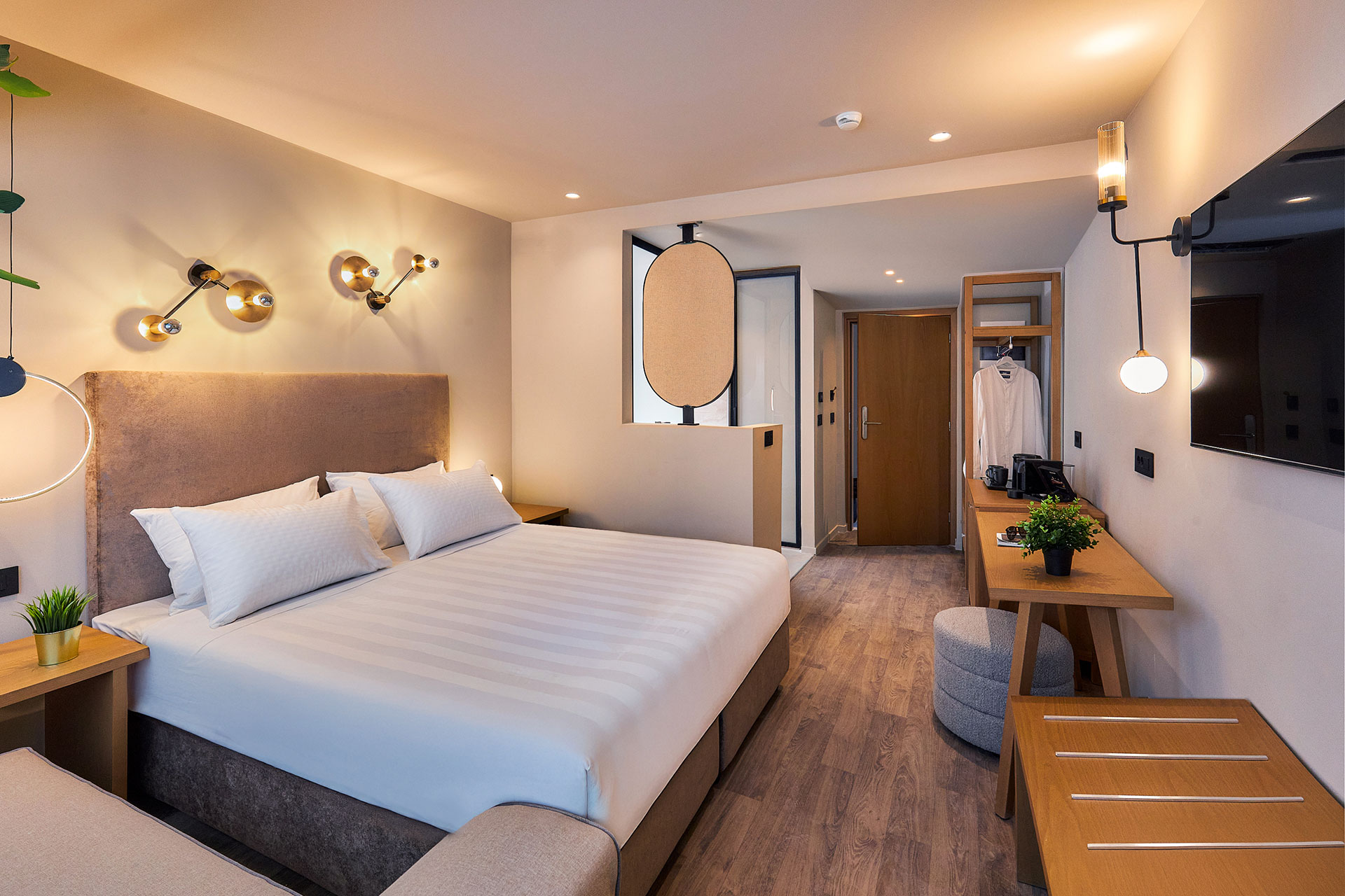 Designed for up to three guests, this room combines a double or twin bed configuration with a cozy sofa bed. The en-suite bathroom features a walk-in shower and premium fittings, while the furnished balcony or terrace offers an inviting spot to unwind and soak in the views.