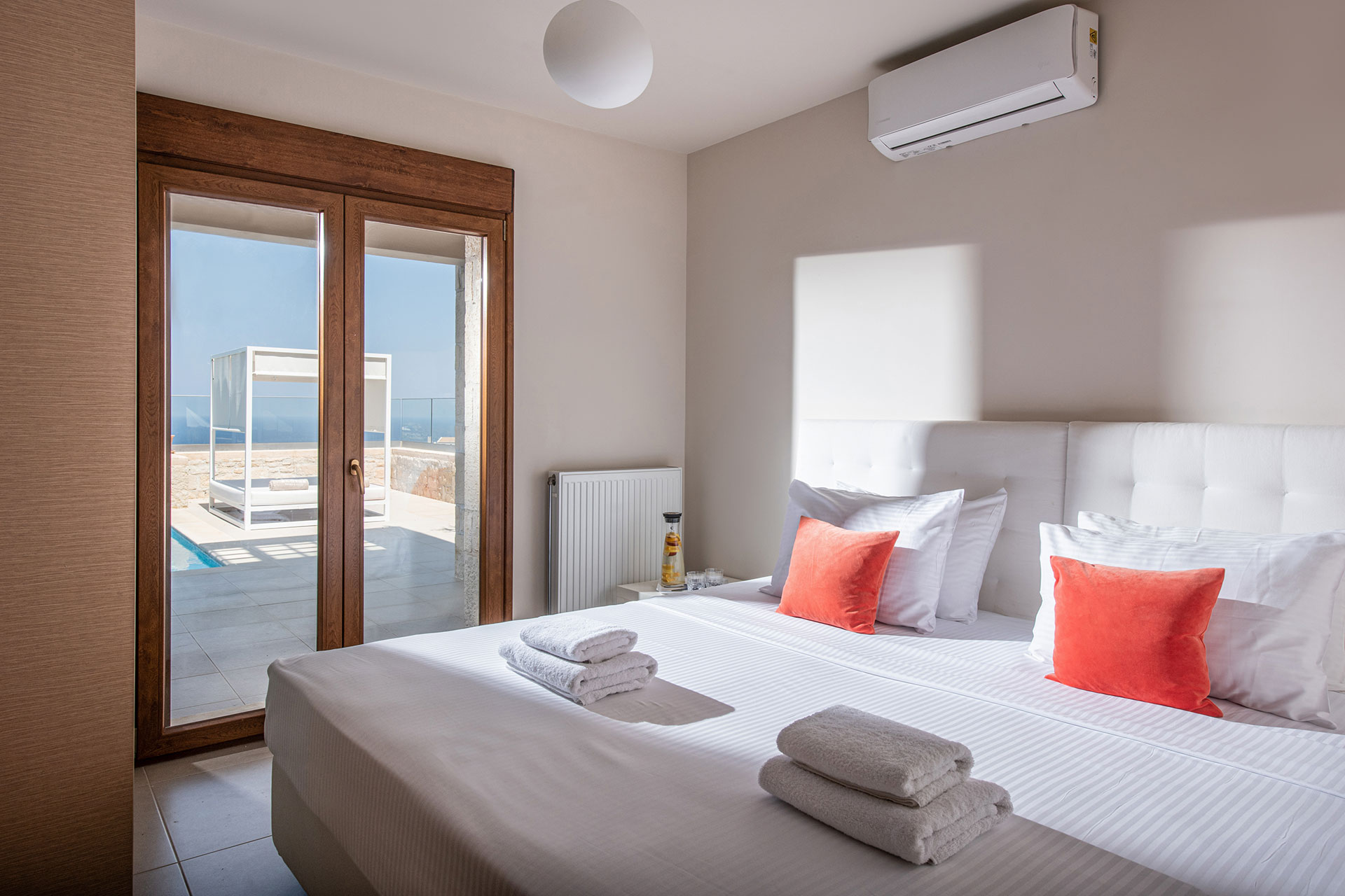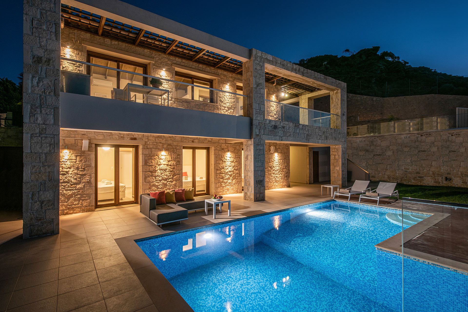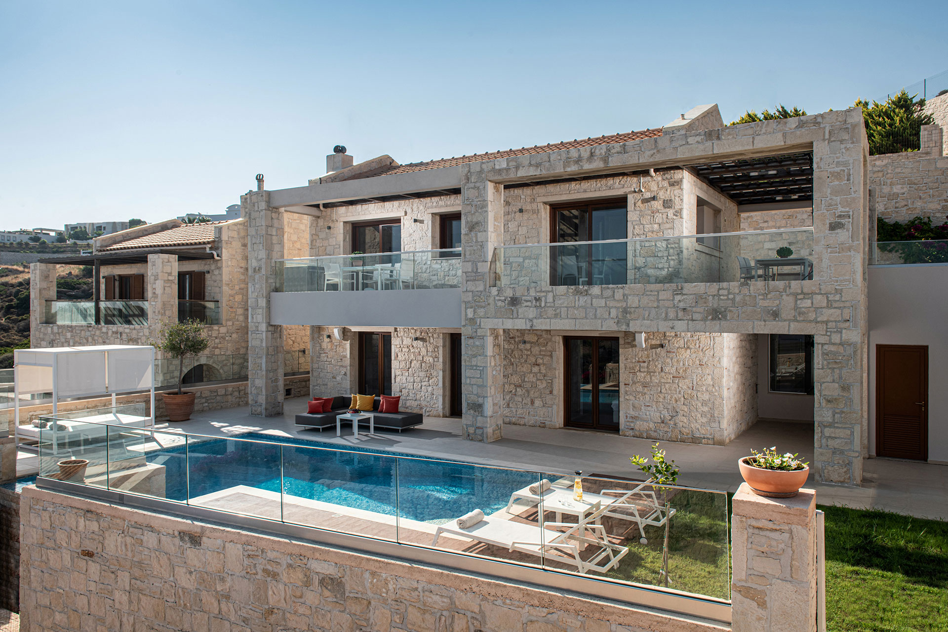 Balconies on both levels overlook the pool, offering a perfect vantage point to soak in the sun, unwind on the loungers and let the ever-changing blues of the sea wash your cares away.