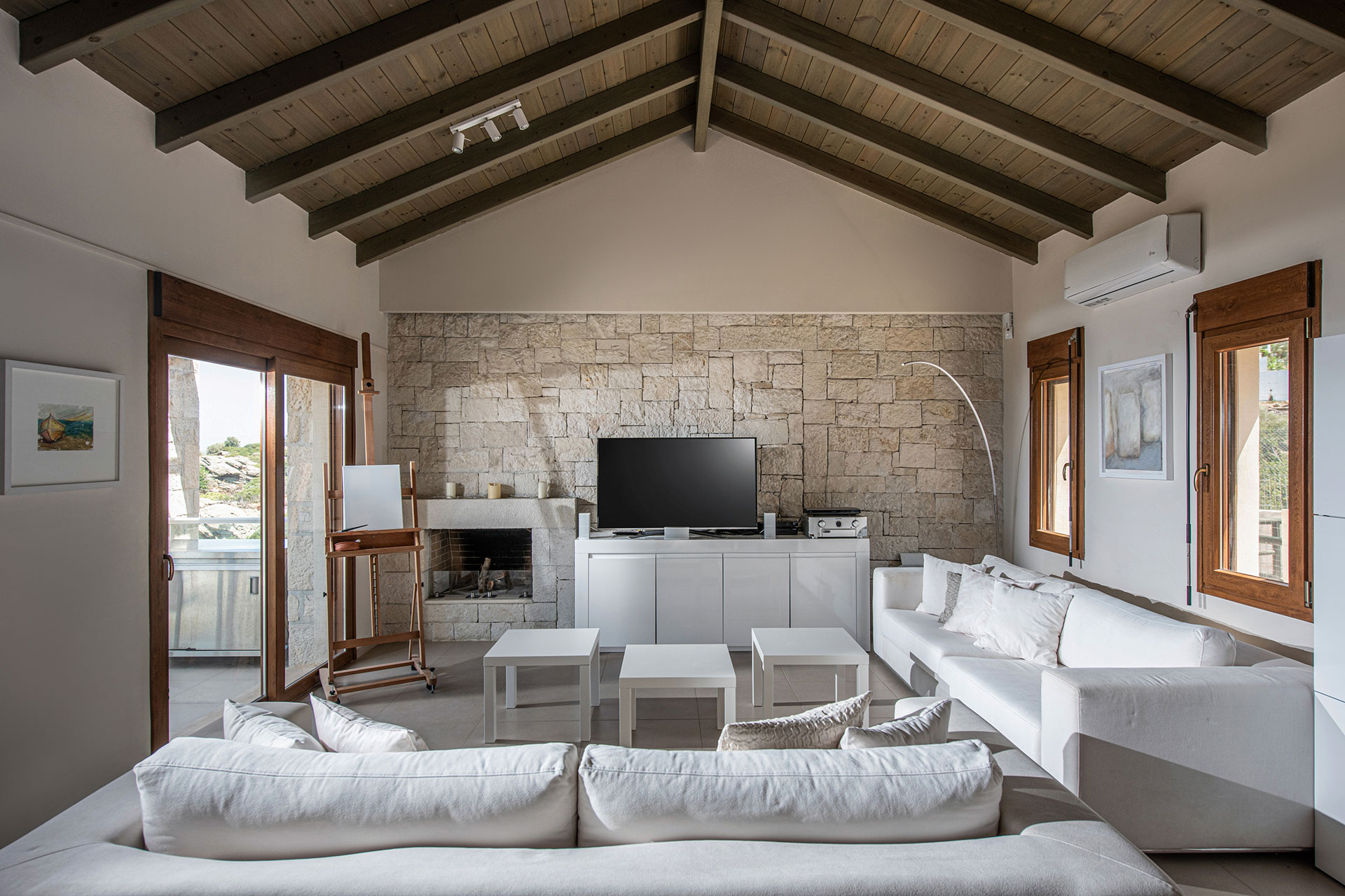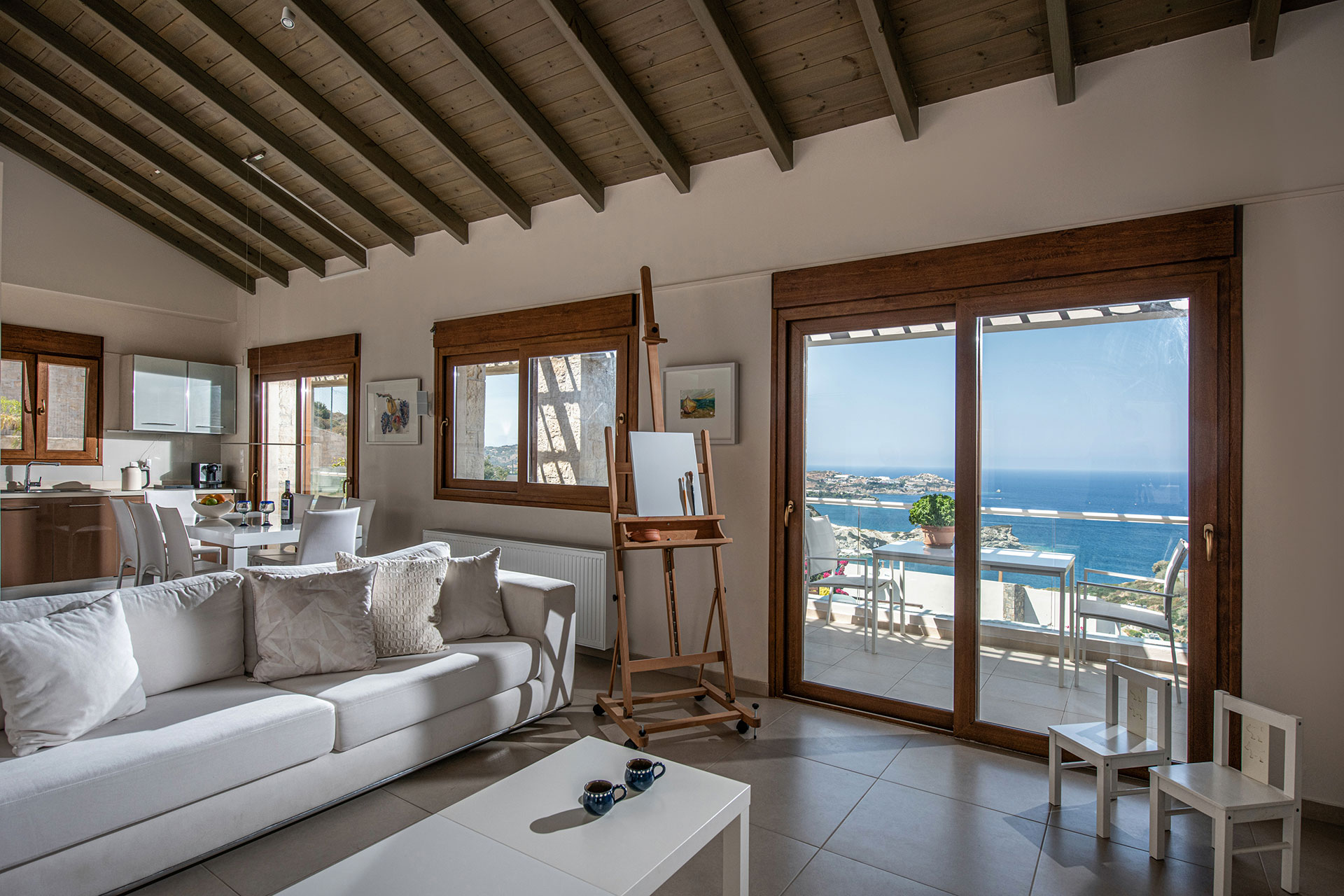 A crisp white color palette enhances the sense of calm, while the expansive living and dining areas, framed by floor-to-ceiling wooden windows, invite gatherings and reflection alike. For the creatively inclined, a wooden art tripod in the living room encourages painting or sketching, inspired by the surrounding beauty.